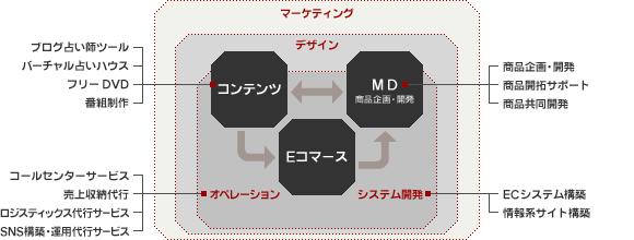 Webや携帯コンテンツ利用者の傾向を分析し、そのデータに基づいた商品企画・開発を行います。また、海外における商品開拓サポートや商品共同開発もお手伝いいたします。